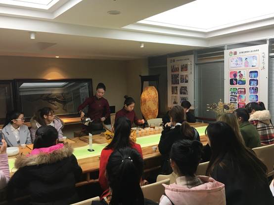 在见习活动中还邀请在茶楼工作的学姐为同学们展现茶艺,古韵古香的茶室中,轻柔的音乐搭配优美的茶艺师技巧表演,同学们享受品茗、研究茶艺,不亦乐乎。