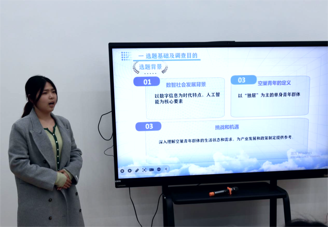 数育巢流代表张笛同学分享了以数学社会视角下空巢青年的社交模式及其消费行为的选题进行了研究汇报,并给出了一个结论:数字社会的发展给我们带来了很多时代红利,也给我们带来了很多机遇,让我们结识朋友的途径更加的多元化,未来的趋势更加个性化。