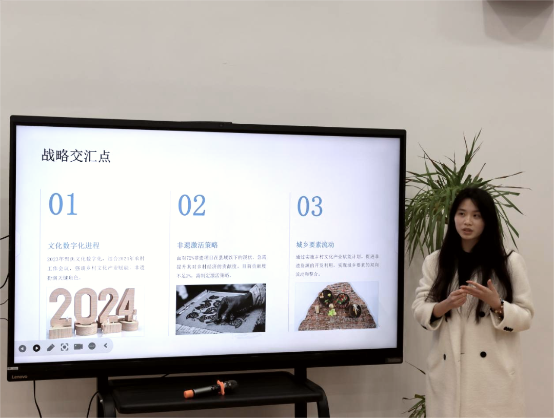 创新创业俱乐部代表宁荣荣同学针对中华传统非遗文化发表了自己的看法,她认为:“非遗文化是一个很关键的角色,应促进它的资源开发,在保护它的同时可以用新的模式去保护它,还可以在原有的基础上进行创新。”