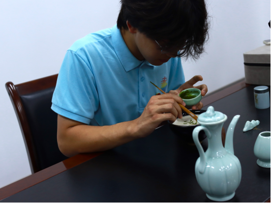 来自茶社的李源彬同学现场演绎了宋代点茶技艺。伴随古琴曲《流水》,李源彬执茶筅击拂茶汤,在茶盏中击出绵密茶沫,随后用茶膏绘制出“茶”字样。这一过程完整再现了《茶录》中“七汤点茶法”,引得在场领导驻足观摩。